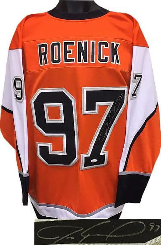 This is a new, in stock, Jeremy Roenick signed Orange Throwback Unlicensed Custom Stitched Hockey Jersey with fully stitched twill numbers on the front and back, there are NO LICENSED TEAM LOGOS, TAGS, BRAND NAMES or PATCHES ON THIS JERSEY & IS NOT AN AUTHENTIC OFFICIALLY LICENSED JERSEY, 100% polyester, made in the Philippines. Size XL (48/50). JSA Hologram and Certificate of Authenticity.
