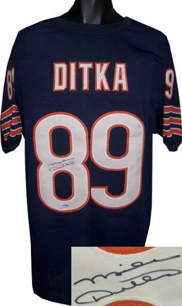 This is a new, in stock, Mike Ditka signed TB Navy unlicensed Custom Stitched Pro Style Football Jersey with fully stitched twill numbers on the front and back and players name plate, there are NO LOGOS, TAGS, BRAND NAMES or PATCHES ON THIS JERSEY & IS NOT AN AUTHENTIC OFFICIALLY LICENSED JERSEY, 100% polyester, made in the Philippines. Size XL (48/50). JSA Hologram and Certificate of Authenticity.
