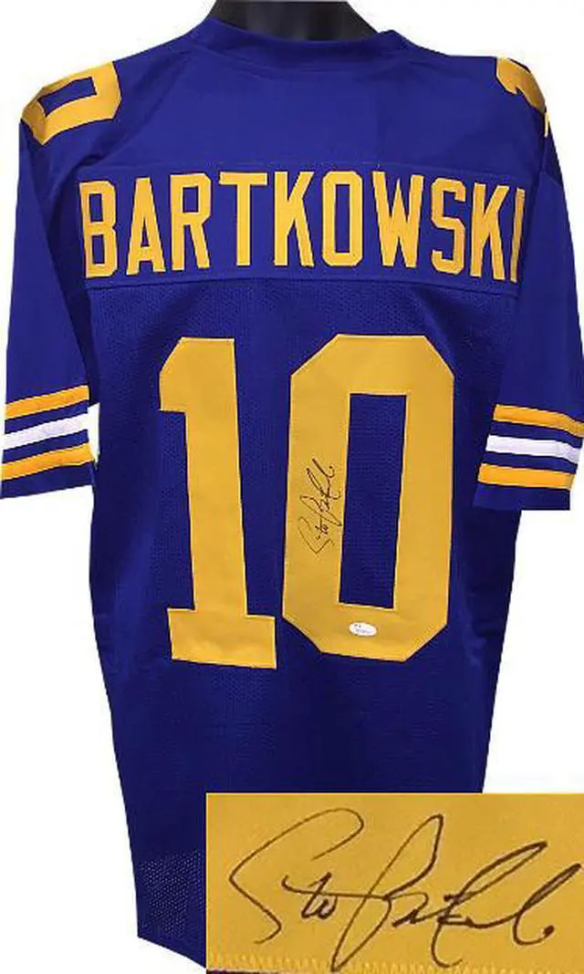 This is a new, in stock, Steve Bartkowski signed Blue Throwback unlicensed Custom Stitched Pro Style Football Jersey with fully stitched twill numbers on the front and back and players name plate, there are NO LOGOS, TAGS, BRAND NAMES or PATCHES ON THIS JERSEY & IS NOT AN OFFICIAL LICENSED JERSEY, 100% polyester, made in the Philippines. Size XL (48/50). JSA Witnessed Hologram and Certificate of Authenticity.