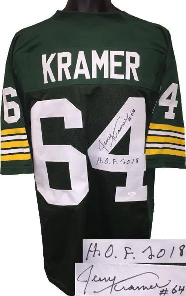 This is a new, in stock, Jerry Kramer signed Green Throwback unlicensed Custom Stitched Pro Style Football Jersey with #64 HOF 2018 inscription, with fully stitched twill numbers on the front and back and players name plate, there are NO LOGOS, TAGS, BRAND NAMES or PATCHES ON THIS JERSEY & IS NOT AN AUTHENTIC OFFICIALLY LICENSED JERSEY, 100% polyester, made in the Philippines. Size XL (48/50). James Spence Witnessed Hologram and Certificate of Authenticity.