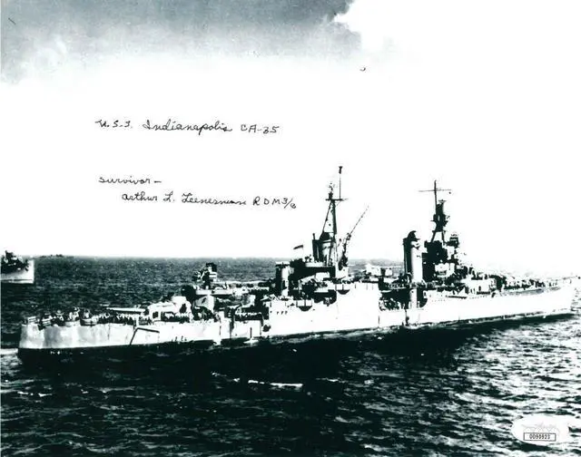 USS Indianapolis (CL/CA-35) was a Portland-class heavy cruiser of the United States Navy, named for the city of Indianapolis, Indiana. Launched in 1931, the vessel served as the flagship for the commander of Scouting Force 1 for eight years, then as flagship for Admiral Raymond Spruance in 1943 and 1944 while he commanded the Fifth Fleet in battles across the Central Pacific during World War II.In July 1945, Indianapolis completed a top-secret high-speed trip to deliver parts of Little Boy, the first nuclear weapon ever used in combat, to the United States Army Air Force Base on the island of Tinian, and subsequently departed for the Philippines on training duty. At 0015 on 30 July, the ship was torpedoed by the Imperial Japanese Navy submarine I-58, and sank in 12 minutes. Of 1,195 crewmen aboard, approximately 300 went down with the ship. The remaining 890 faced exposure, dehydration, saltwater poisoning, and shark attacks while stranded in the open ocean with few lifeboats and almost no food or water. The Navy only learned of the sinking four days later, when survivors were spotted by the crew of a PV-1 Ventura on routine patrol. Only 316 survived. The sinking of Indianapolis resulted in the greatest single loss of life at sea, from a single ship, in the history of the US Navy. Arthur Leenerman has hand signed this 8x10 Photo with USS Indianapolis CA-35 Survivor inscription. JSA Hologram #DD90923 and Certificate of Authenticity.