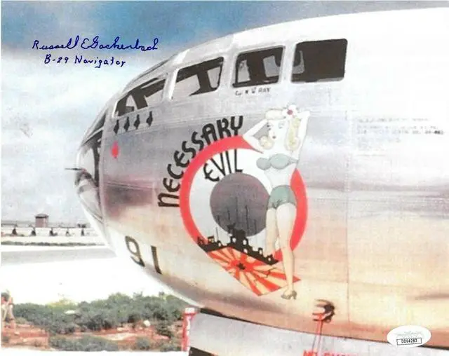 Russell Gackenbach served as a 2nd Lieutenant in the 393rd Bombardment Squadron and in the 509th Composite Group. He flew in the Necessary Evil during the August 1945 Hiroshima bombing mission and in the Enola Gay during the Nagasaki bombing mission. On August 6, 1945 Gackenbach was a navigator aboard Necessary Evil, one of two B-29’s that accompanied the Enola Gay. The mission of Gackenbach’s aircraft was strike observation and photography. In the aftermath of the detonation of the Little Boy bomb, Gackenbach took a photo from 31,000 feet and sixteen miles from Hiroshima. The crew of Necessary Evil did not know at the time that they had dropped the first atomic bomb. He recalls being ushered into a debriefing immediately upon their return to the base. Russell Gackenbach has hand autographed this Vintage Color 8x10 Photo with B-29 Navigator inscription. JSA Hologram #DD64283 and Certificate of Authenticity.
