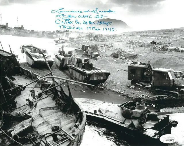 Lawrence Snowden was a lieutenant general in the United States Marine Corps. In 1995, he founded the annual Reunion of Honor, a program honoring those who lost their lives on both sides of the Battle of Iwo Jima. Lawrence Snowden has hand signed this Vintage B&W 8x10 Photo with Lt Gen, USMC, Ret, CO, Fox CO, 23 Regt, 4th Division 19 Feb 1945 inscriptions. JSA Hologram #DD64284 and Certificate of Authenticity.