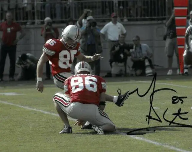 While attending Ohio State University, Mike Nugent played for coach Jim Tressel's Ohio State Buckeyes football team from 2001 to 2004. During his four-year career at Ohio State, he broke or tied 22 school records, including most points in a career by any player at Ohio State (356). He also was part of the 2002 Ohio State Buckeyes Division I National Championship team. He became the first kicker in school history to earn team most valuable player honors. Mike Nugent has hand signed this Ohio State Buckeyes 8x10 Photo #85. Certificate of Authenticity from Athlon Sports Collectibles.