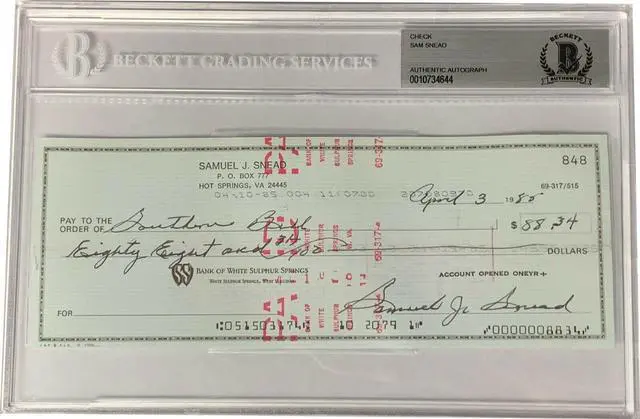 Sam Snead was one of the top players in the world for most of four decades. Snead won seven majors: three Masters, three PGA Championships and one British Open. Sam Snead has hand signed this Bank Check Signed In Black Beckett BAS #0010734644.