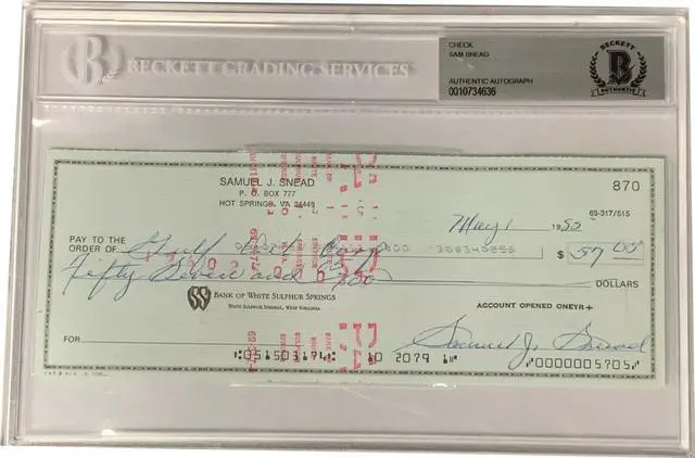 Sam Snead was one of the top players in the world for most of four decades. Snead won seven majors: three Masters, three PGA Championships and one British Open. Sam Snead has hand signed this Bank Check Signed In Blue Beckett BAS #0010734636.