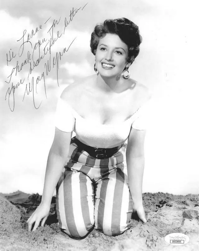 In 1954, she adopted the stage name of May Wynn after she played a character of that name in The Caine Mutiny. Wynn later was cast as the lead actress in the 1956 feature films The Man Is Armed and The White Squaw, and in the Jack Webb-created NBC television series, Noah's Ark. May Wynn has hand signed this 8x10 Photo with Hi Lonna Thank you for your beautiful letter inscription. JSA Hologram #DD32895 and Certificate of Authenticity.