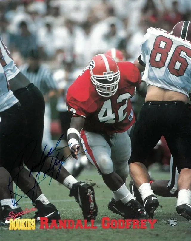 Randall Godfrey accepted a scholarship from the University of Georgia, becoming the first true freshman in school history to lead the team in tackles (114) and was also named SEC Freshman of the Year. The next year, he repeated as the team leader in tackles (114) and earned All-SEC honors. As a junior, he registered 102 tackles (second on the team), 2 sacks and 5 passes defensed. In his last year he missed four games with a pulled hamstring, affecting his playing time and finishing with 35 tackles (3 for loss). Randall Godfrey has hand signed this Georgia Bulldogs Signature Rookies 8x10 Photo. Signature Rookies Hologram and Certificate of Authenticity from Athlon Sports Collectibles.