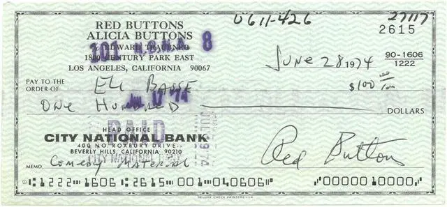 Red Buttons was an American actor and comedian. He won an Oscar and a Golden Globe for his supporting role in the 1957 film Sayonara. Red Buttons has hand signed this 1974 Personal Cancelled Check. PSA Letter of Authenticity, Near Mint signature.
