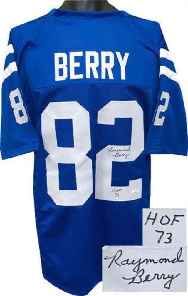 This is a new, in stock, Raymond Berry signed Blue Throwback unlicensed Custom Stitched Pro Style Football Jersey with HOF 73 inscription with fully stitched twill numbers on the front and back and players name plate, there are NO LOGOS, TAGS, BRAND NAMES or PATCHES ON THIS JERSEY & IS NOT AN AUTHENTIC OFFICIALLY LICENSED JERSEY, 100% polyester, made in the Philippines. Size XL (48/50). JSA Witnessed Hologram and JSA Certificate of Authenticity.