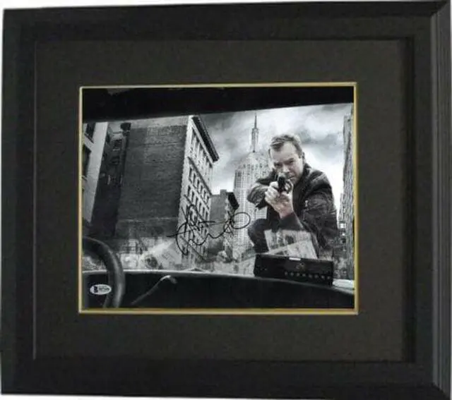 Kiefer Sutherland is known for his role as Jack Bauer in the Fox drama series 24 (2001–2010, 2014), for which he won an Emmy Award, a Golden Globe Award, two Screen Actors Guild Awards, and two Satellite Awards. Kiefer Sutherland has hand signed this "24" Jack Bauer 11x14 Photo. Beckett/BAS Hologram #B57690 and Certificate of Authenticity from Athlon Sports Collectibles. Custom Black Mat and Black Frame as shown