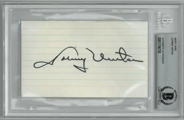 Johnny Unitas who played from the 1950s through the 1970s. He spent the majority of his career playing for the Baltimore Colts. He was a record-setting quarterback, and the National Football League's most valuable player in 1959, 1964 and 1967. For 52 years he held the record for most consecutive games with a touchdown pass (which he set between 1956–1960), until New Orleans Saints quarterback Drew Brees broke his long standing record on October 7, 2012. Unitas was the prototype of the modern era marquee quarterback with a strong passing game, media fanfare, and widespread popularity. He has been consistently listed as one of the greatest NFL players of all time. Johnny Unitas has hand signed this 3X5 Index Card. Beckett/BAS #00011746750 Slabbed