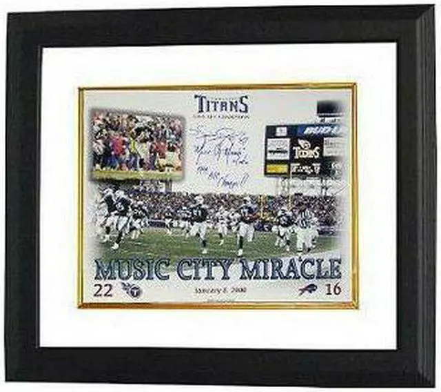 Steve Christie from the Buffalo Bills kicked off, and Tennessee Titans player Lorenzo Neal received. Neal handed the ball off to Titans tight end Frank Wycheck, who threw a lateral across the field to another Titans player, Kevin Dyson, who then ran down the sidelines for a 75-yard touchdown. The play was named "Home Run Throwback" by the Titans and was developed by Special Teams Coordinator Alan Lowry. The Titans ran the play regularly in practices during the regular season, though the practices usually involved Derrick Mason, who had been injured earlier in the game and was unavailable for the situation. Dyson, as one of the team's lead wide receivers, rarely practiced with the special teams unit and was largely unfamiliar with the layout of the play. Nevertheless, his execution of Lowry's vision was flawless and thus became the "Music City Miracle". This Music City Miracle 11X14 Photo is hand signed by Kevin Dyson with Music City Miracle 1/8/00 inscription and 1999 AFC Champs. Private Signing in Nashville, TN. Photo of the Signing and JSA Hologram and JSA Certificate of Authenticity. Custom White Mat and Premium Black Frame as shown.