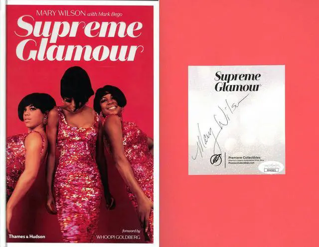 As Motown’s leading act in the 1960s, The Supremes became synonymous with glamorous, elegant, coordinated ensembles. Supreme Glamour presents founding member Mary Wilson’s unparalleled collection, showcasing thirty-two of the group’s most eye-catching gowns, meticulously reassembled and photographed on the Grammy Museum stage. Detailed captions accompany each photograph, providing information about the design, fabric, and embellishments of each ensemble, as well as the occasion on which each was first worn. Sumptuously illustrated, engaging, and insightful, Mary Wilson’s book charts the glittering story of The Supremes, as it showcases their glamorous and iconic ensembles. This Includes: Hardcover First Edition of "Supreme Glamour" with Mary Wilson's Personal Autograph on Bookplate Inside Book. JSA Hologram and JSA Certificate of Authenticity.