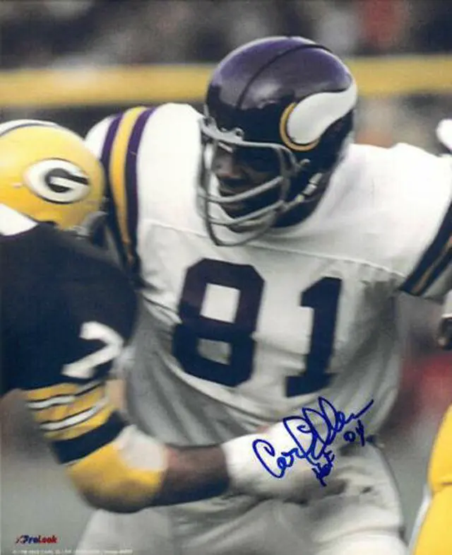 In 1964, Carl Eller was drafted in the first round of the NFL draft by the Minnesota Vikings. As the left defensive end in the Vikings front four, he was a major factor in the unit known as the "Purple People Eaters". Starting in 1968, Eller's fifth campaign, Minnesota won 10 Central Division titles in the next 11 seasons. The Vikings won the 1969 NFL championship and NFC crowns in 1973, 1974, and 1976 and played in four Super Bowls. Eller was named the AP Defensive Player of the Week after week 9, 1968. He was selected to play in six Pro Bowls (1968-1971, 1973, and 1974). Carl Eller has hand autographed this Minnesota Vikings 8x10 Photo with HOF 04 Inscription. Certificate of Authenticity from Athlon Sports Collectibles.