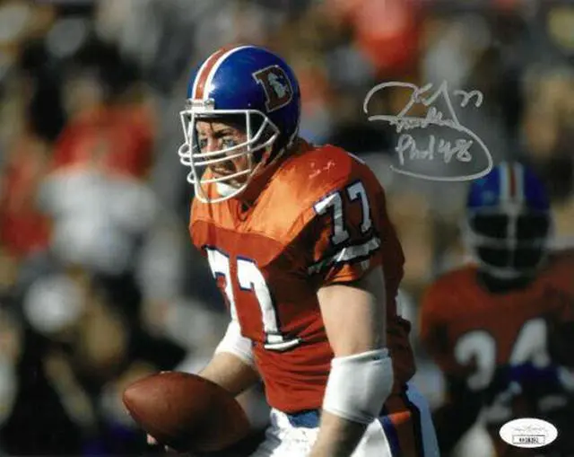 In 1983, the Denver Broncos drafted Karl Mecklenburg in the 12th round with the 310th pick overall. Mecklenburg went on to become an integral part of the Broncos' Super Bowl teams of the 1980s. He played in six Pro Bowls. His 79.5 sacks is the second highest total in franchise history. In 2001, during half time of a game against the Baltimore Ravens, he and Dennis Smith were inducted into the Denver Broncos Ring of Fame. Karl Mecklenburg has hand signed this Denver Broncos 8X10 Photo with Phil 4:8 inscription. JSA Hologram and JSA Certificate of Authenticity.