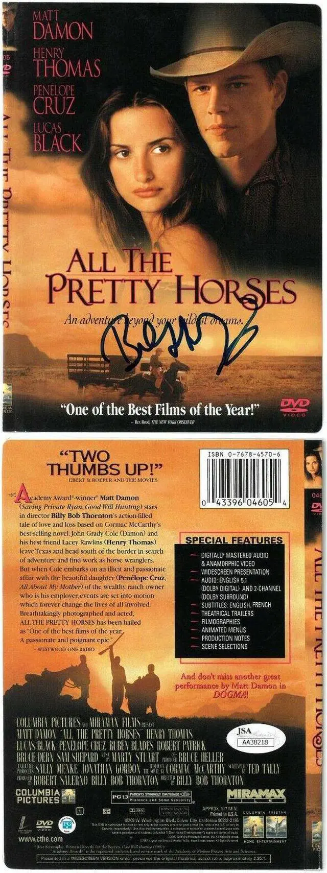 Billy Bob Thornton is an American actor, filmmaker, singer, songwriter, and musician. Thornton had his first break when he co-wrote and starred in the 1992 thriller One False Move, and came to international attention after writing, directing, and starring in the independent drama film Sling Blade (1996), for which he won an Academy Award for Best Adapted Screenplay and was nominated for an Academy Award for Best Actor. He has been nominated for an Emmy Award, four Golden Globes, and three Screen Actors Guild Awards. Billy Bob Thornton has hand signed this 2000 All The Pretty Horses DVD Video/Movie Cover. JSA Hologram #AA38218 and JSA Certificate of Authenticity.