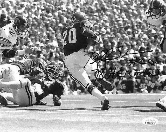 In his junior season Billy Sims cut loose, picking up 1,762 yards on 231 carries for an amazing average of 7.6 yards per carry for the regular season. Including the post-season Sims had 1,896 yards, a total yardage school record that stood until 2004 when freshman Adrian Peterson tallied up 1,925. In 1978 Sims was awarded the Heisman Trophy, becoming only the sixth junior to do so. He led the nation in rushing with 1,896 yards and had 22 touchdowns. He also became the first running back in Big 8 Conference history to rush for 200-yards in three consecutive games, and had four 200-yard games in a single season. Billy Sims has hand autographed this Oklahoma Sooners 8x10 B&W Photo with #20 78 Heisman inscription. JSA Hologram and JSA Certificate of Authenticity.