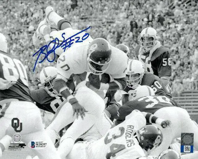 In his junior season Billy Sims cut loose, picking up 1,762 yards on 231 carries for an amazing average of 7.6 yards per carry for the regular season. Including the post-season Sims had 1,896 yards, a total yardage school record that stood until 2004 when freshman Adrian Peterson tallied up 1,925. In 1978 Sims was awarded the Heisman Trophy, becoming only the sixth junior to do so. He led the nation in rushing with 1,896 yards and had 22 touchdowns. He also became the first running back in Big 8 Conference history to rush for 200-yards in three consecutive games, and had four 200-yard games in a single season. Billy Sims has hand autographed this Oklahoma Sooners 8x10 B&W Photo with #20. Beckett Witnessed Hologram and Beckett Certificate of Authenticity.