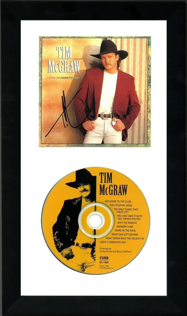 Tim McGraw is an American country singer, songwriter, and actor. He has been married to singer Faith Hill since 1996, and is a son of the late baseball player Tug McGraw. McGraw has released fourteen studio albums (eleven for Curb Records and three for Big Machine Records). 10 of those albums have reached number 1 on the Top Country Albums charts, with his 1994 breakthrough album Not a Moment Too Soon being the top country album of 1994. Tim McGraw has hand signed this Self Titled Album CD Cover with CD. JSA Hologram #GG08351 and JSA Certificate of Authenticity. Custom White Mat and Black Frame as shown to overall size 6.5 inch x 12 inch. Handling/condition as shown