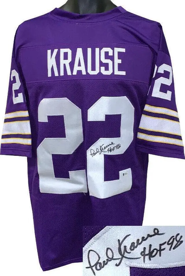 This is a new, in stock, Paul Krause signed Purple Throwback unlicensed Custom Stitched Pro Style Football Jersey with HOF 98 inscription with fully stitched twill numbers on the front and back and players name plate, there are NO LOGOS, TAGS, BRAND NAMES or PATCHES ON THIS JERSEY & IS NOT AN AUTHENTIC OFFICIALLY LICENSED JERSEY, 100% polyester, made in the Philippines. Size XL (48/50). Beckett Hologram #F78154 and Beckett Certificate of Authenticity.
