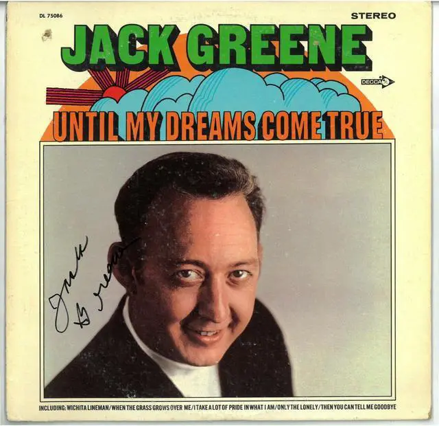 Jack Greene was an American country musician. Nicknamed the "Jolly Greene Giant" due to his height and deep voice, Greene was a long time member of the Grand Ole Opry. A three-time Grammy Award nominee, Greene is best known for his 1966 hit, "There Goes My Everything". Greene had a total of five No. 1 country hits and three others that reached the top ten. Jack Greene has hand signed this 1969 Until My Dreams Come True Album Cover/LP/Vinyl Record. JSA #GG08522 with JSA Certificate of Authenticity. Vinyl records ARE INCLUDED with the signed album cover. We cannot offer an accurate condition grade or assessment regarding either the cover or vinyl record/disc condition. All album covers and vinyl records/discs are in USED condition and will show some signs of handling, as shown.