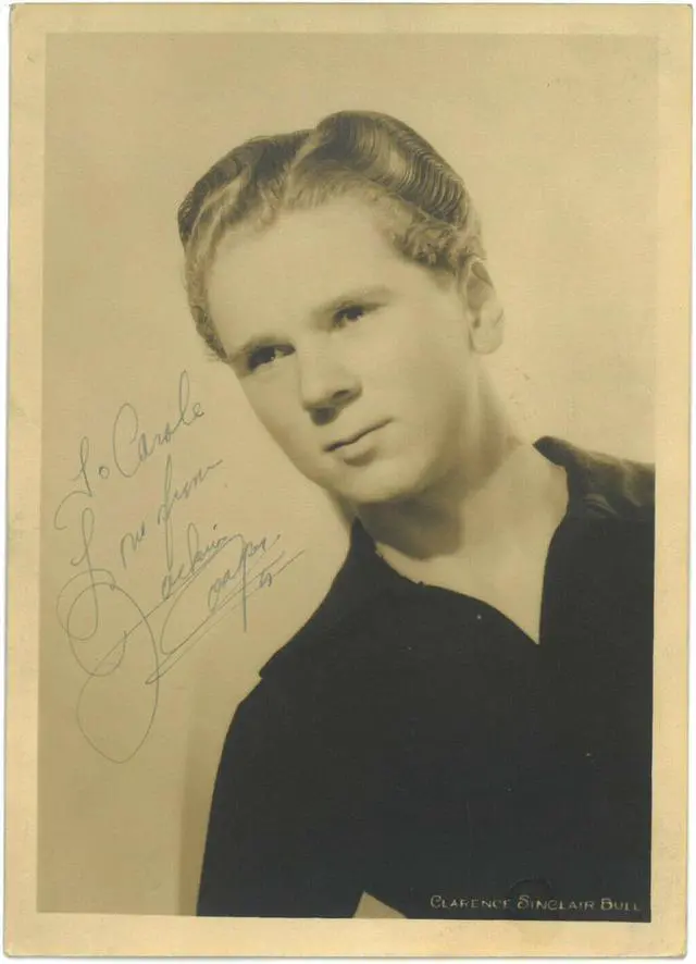 Jackie Cooper was an American actor, television director, producer, and executive. He was a child actor who made the transition to an adult career. Cooper was the first child actor to receive an Oscar nomination. At age 9 he was the youngest performer to be nominated for an Academy Award for Best Actor in a Leading Role, an honor that he received for the film Skippy (1931). Jackie Cooper has hand signed this Vintage 1930's Sepia 5x7 Photo with To Carol Love From inscription. JSA #HH18829 with JSA Certificate of Authenticity. Pristine Vintage Condition.