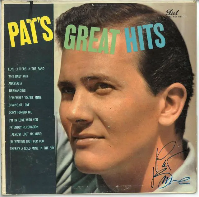 Pat Boone is an American singer, composer, actor, writer, television personality, motivational speaker, and spokesman. He was a successful pop singer in the United States during the 1950s and early 1960s. He sold more than 45 million records, had 38 top-40 hits, and appeared in more than 12 Hollywood films. Pat Boone has hand signed this 1957 Pat's Great Hits Album Cover/LP/Vinyl Record. JSA Authentication Sticker & Certificate of Authenticity #EE57752. Handling/condition as shown