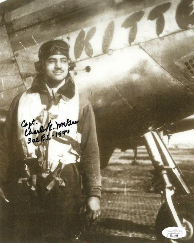 Charles E. McGee is a retired African-American fighter pilot who was one of the Tuskegee Airmen and a career officer in the United States Air Force for 30 years who flew a total of 409 combat missions in World War II, Korea and Vietnam. Charles E. McGee has hand signed this 8x10 Photo with 302 F. S. - 1944 inscription. JSA Authentication Sticker & Certificate of Authenticity #II11098