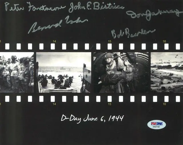Allied infantry and armoured divisions began landing on the coast of France at 06:30. Allied casualties were documented for at least 10, 000, with 4, 414 confirmed dead. This D-Day Veterans 8x10 Filmstrip Photograh has been hand signed by 5 veterans including: Bob Bearden, John Bistrica, Peter Fantacone, Don Jakeway & Bernard Nolan. PSA Authentication Sticker & Full Letter of Authenticity #AA07187. Minor dings on upper left on photo sold as is, no returns.