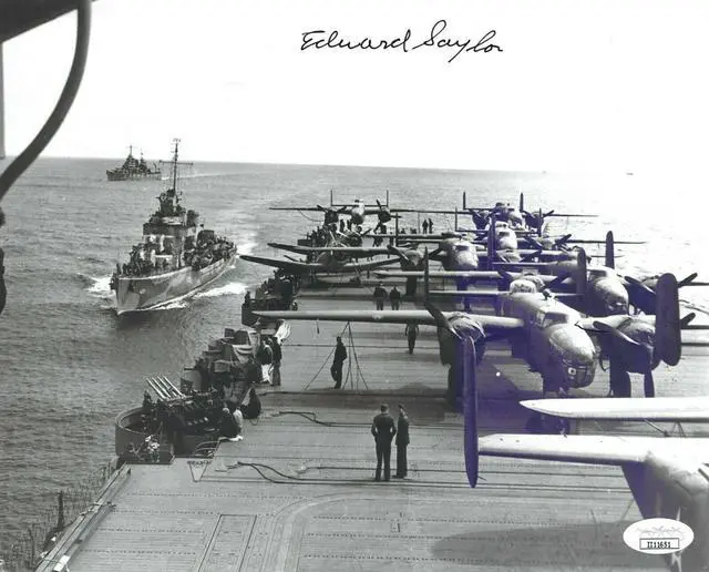 Lieutenant Colonel Edward Saylor served in the U. S. Air Force. He was a veteran of World War II and participated in the Doolittle Raid on Japan on April 18, 1942. Saylor was the flight engineer for Crew#15 of the Doolittle Raiders. Saylor was one of the last four surviving Doolittle Raiders at the time of his death in 2015. Edward Saylor has hand signed this 8x10 Photo. JSA Authentication Sticker & Certificate of Authenticity #II11651