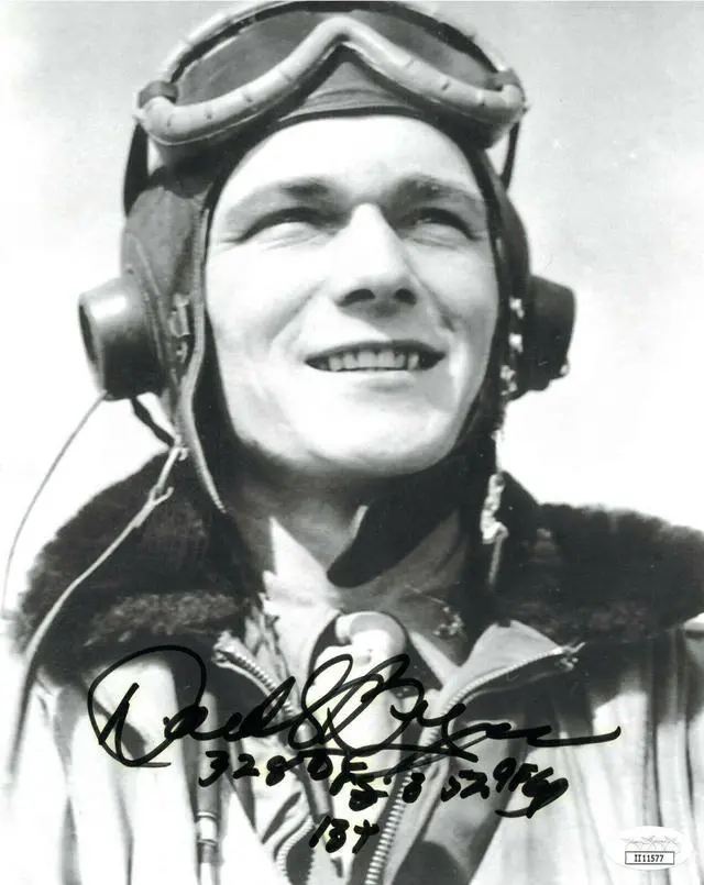Donald Bryan, a retired U. S. Air Force lieutenant colonel and decorated veteran of World War II (1941-45), lived in Adel for more than thirty years. He wasa former member of the famed Eighth Army Air Force, or "Mighty Eighth. " Bryan flew for the 352d Fighter Group and during his lifetime was considered to be the 352d's "leading living ace. " Officially credited with 13.3 downed enemy aircraft—including five in one day during a harrowing fifteen-minute dogfight—Bryan was awarded the Distinguished Service Cross. Donald Bryan has hand signed this 8x10 Photo with 352d Fighter Group+ inscription and with 13+ (Kills) inscription.