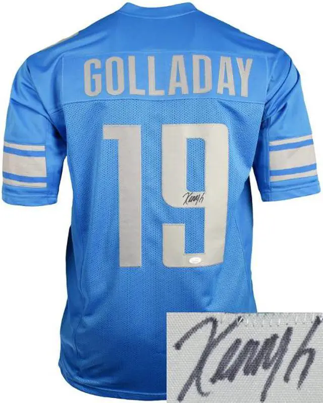 This is a new, in stock, Kenny Golladay signed Blue unlicensed Custom Stitched Pro Style Football Jersey #19 with fully stitched twill numbers on the front and back and players name plate, there are NO LOGOS, TAGS, BRAND NAMES or PATCHES ON THIS JERSEY & IS NOT AN AUTHENTIC OFFICIALLY LICENSED JERSEY, 100% polyester, made in the Philippines. Size XL (48/50). JSA Witnessed Authentication Sticker and JSA Certificate of Authenticity