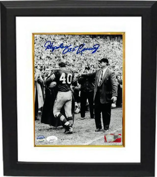 Hopalong Cassady played for the Ohio State Buckeyes from 1952-55. During his college career, he scored 37 touchdowns in 36 games. He also played defensive back; a pass was never completed on him in his four years at the university. In 1955, Cassady won the Heisman Trophy (by the largest margin at the time), the Maxwell Award, and was named the Associated Press Athlete of the Year. Hopalong Cassady has hand autographed this Ohio State Buckeyes 8x10 Photo. JSA Authentication Sticker & Certificate of Authenticity. Custom White Mat and Premium Black Frame as shown.