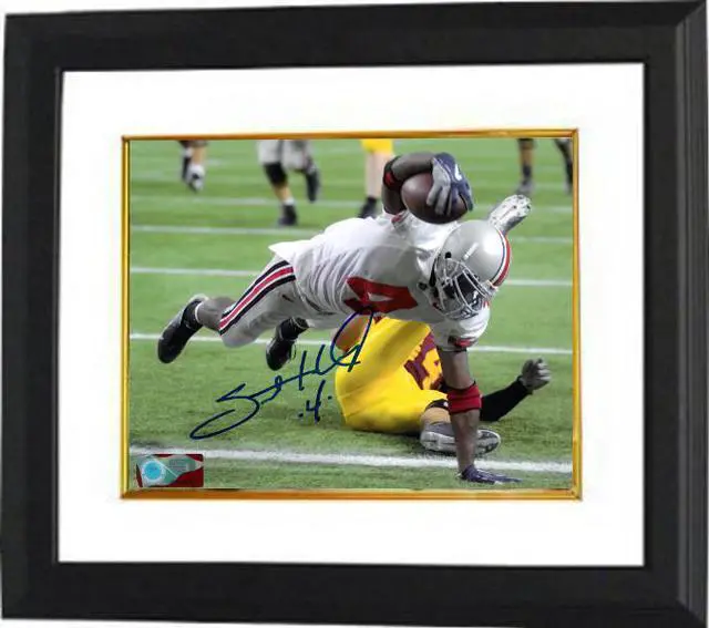 Santonio Holmes attended Ohio State University where he was red shirted when Ohio State won the 2002 national Championship. Holmes caught 245 passes for 2, 295 yards and 25 touchdowns, while gaining 3, 123 all-purpose yards. His 240 career receptions and 3, 496 yards ranked were the fifth totals highest in school history at the time. His 25 touchdown catches ranked him 3rd. Santonio Holmes has hand autographed this Ohio State Buckeyes NCAA Licensed 8x10 Photo. Certificate of Authenticity from Athlon Sports Collectibles. Custom White Mat and Premium Black Frame as shown.
