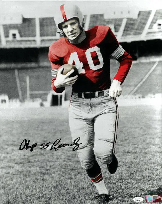 Hopalong Cassady played for the Ohio State Buckeyes from 1952-55. During his college career, he scored 37 touchdowns in 36 games. He also played defensive back; a pass was never completed on him in his four years at the university. In 1955, Cassady won the Heisman Trophy (by the largest margin at the time), the Maxwell Award, and was named the Associated Press Athlete of the Year. Hopalong Cassady has hand autographed this Ohio State Buckeyes NCAA Licensed Spotlight 16x20 Photo. JSA Authentication Sticker & JSA Certificate of Authenticity.