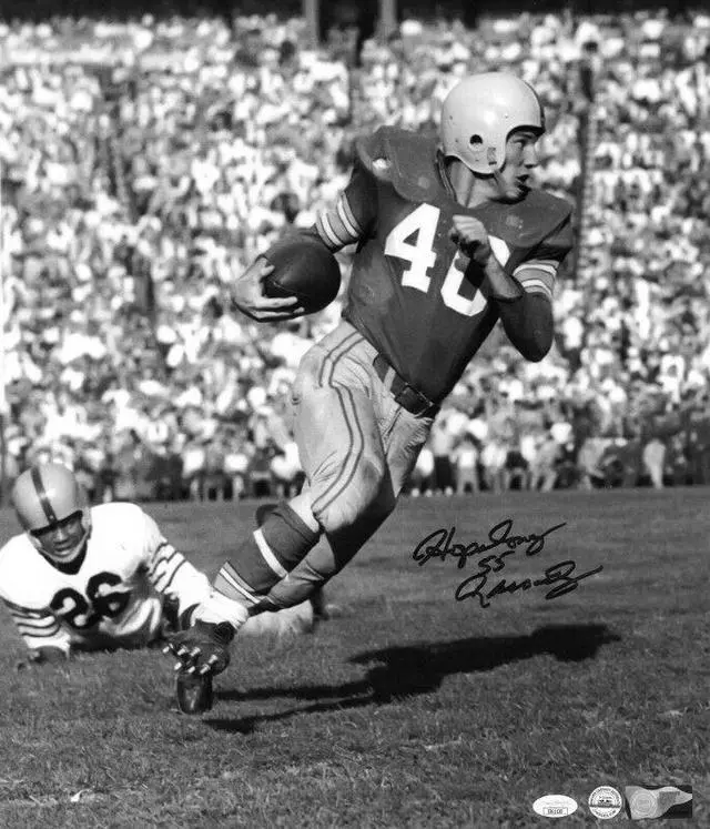 Hopalong Cassady played for the Ohio State Buckeyes from 1952-55. During his college career, he scored 37 touchdowns in 36 games. He also played defensive back; a pass was never completed on him in his four years at the university. In 1955, Cassady won the Heisman Trophy (by the largest margin at the time), the Maxwell Award, and was named the Associated Press Athlete of the Year. Hopalong Cassady has hand autographed this Ohio State Buckeyes NCAA Licensed B&W 16x20 Photo. JSA Authentication Sticker #II61120 & JSA Certificate of Authenticity.