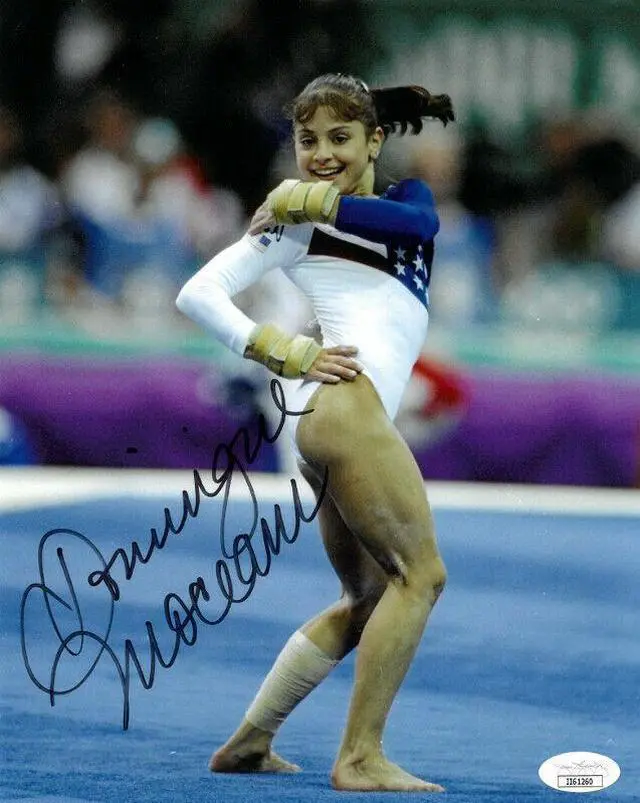 Dominique Moceanu was a member of the gold-medal-winning United States women's gymnastics team (the "Magnificent Seven") at the 1996 Summer Olympics in Atlanta. She was the youngest member of the gold-medal-winning 1996 Olympics team, and was the last gymnast to compete legally in the Olympics at the age of 14. Dominique Moceanu has hand signed this Team USA Olympics Gymnastic 8x10 Photo from the 1996 Olympics in Atlanta Georgia. JSA Authentication Sticker & JSA Certificate of Authenticity