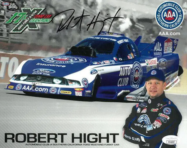 Robert Hight is an NHRA drag racer and president of John Force Racing, and driver of the Auto Club of Southern California Chevrolet Camaro SS Funny Car. He is a two-time NHRA Mello Yello Drag Racing Series Funny Car champion, with titles in 2009 and 2017. Hight has finished in the top 10 in points in all 13 of his competitive seasons. Robert Hight has hand signed this 8x10 Photo. JSA Authentication Sticker & Certificate of Authenticity #II11057
