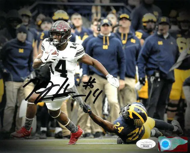 The 2018 season was award-winning for KJ Hill, where he was named as an all-Big Ten Honorable Mention for his 70-catch, 885-yard, six-touchdown season. In a win over Minnesota, Hill set a career high with 187 receiving yards, the eighth-highest total in school history, and two touchdowns, off nine receptions. KJ Hill has hand autographed this Ohio State Buckeyes NCAA Licensed 8x10 Photo #14. JSA Authentication Sticker & JSA Certificate of Authenticity