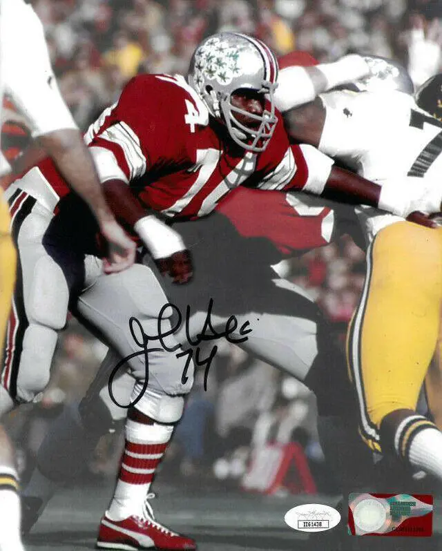 During John Hicks' three years, Ohio State posted a 28-3-1 record, and each year, Ohio State won the Big Ten Championship and went to the Rose Bowl, making Hicks the first person from OSU to play in three Rose Bowls. His stellar senior season and dominance of the line of scrimmage caught the eye of the voters as Hicks won the Lombardi Award and the Outland Trophy and finished runner up to John Cappelletti for the 1973 Heisman trophy. John Hicks has hand autographed this Ohio State Buckeyes NCAA Licensed 8x10 Photo #74.