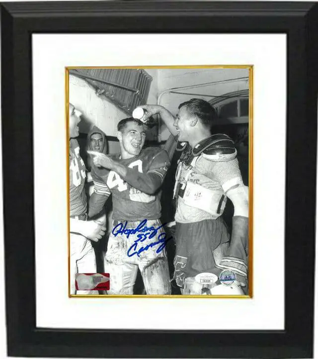 Hopalong Cassady played for the Ohio State Buckeyes from 1952-55. During his college career, he scored 37 touchdowns in 36 games. He also played defensive back; a pass was never completed on him in his four years at the university. In 1955, Cassady won the Heisman Trophy (by the largest margin at the time), the Maxwell Award, and was named the Associated Press Athlete of the Year. Hopalong Cassady has hand autographed this Ohio State Buckeyes NCAA Licensed 8x10 Photo. JSA Authentication Sticker & JSA Certificate of Authenticity. Custom White Mat and Premium Black Color Framed as shown.