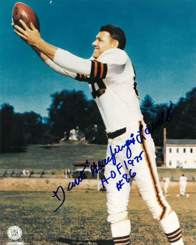 Dante Lavelli was an American football end who played for the Cleveland Browns. Lavelli was known for his sure hands and improvisations on the field. He was also renowned for making catches in critical situations, earning the nickname "Mr. Clutch". He was elected to the Pro Football Hall of Fame in 1975. Dante Lavelli has hand signed this Cleveland Browns 8x10 Photo with dual Gluefingers and HOF 1975 inscriptions. Certificate of Authenticity from Athlon Sports Collectibles.