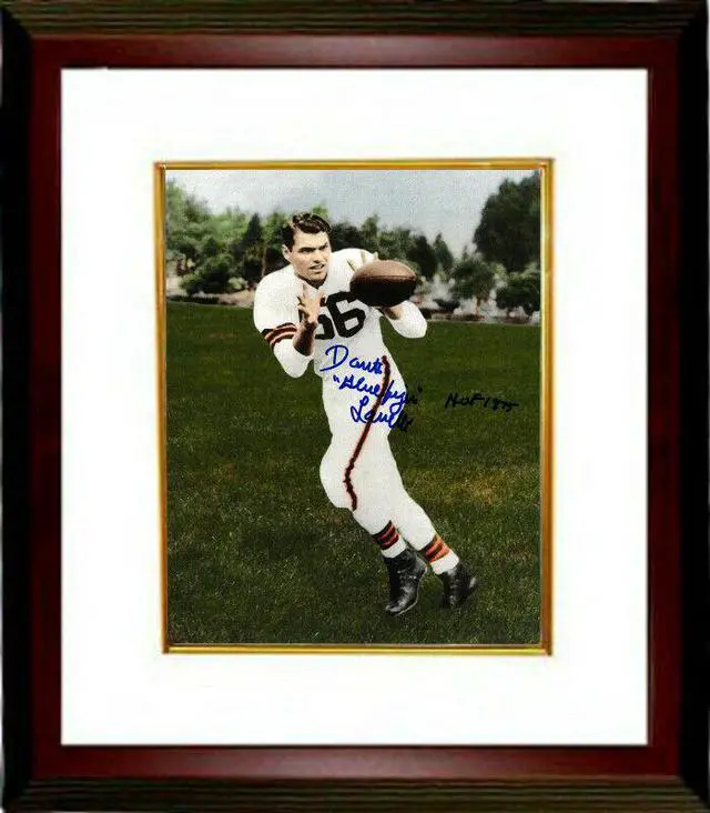 Dante Lavelli was an American football end who played for the Cleveland Browns. Lavelli was known for his sure hands and improvisations on the field. He was also renowned for making catches in critical situations, earning the nickname "Mr. Clutch". He was elected to the Pro Football Hall of Fame in 1975. Dante Lavelli has hand signed this Cleveland Browns 8x10 Photo with dual Gluefingers and HOF 1975 inscriptions. Certificate of Authenticity from Athlon Sports Collectibles. Custom White Mat and Premium Mahogany Frame as shown.
