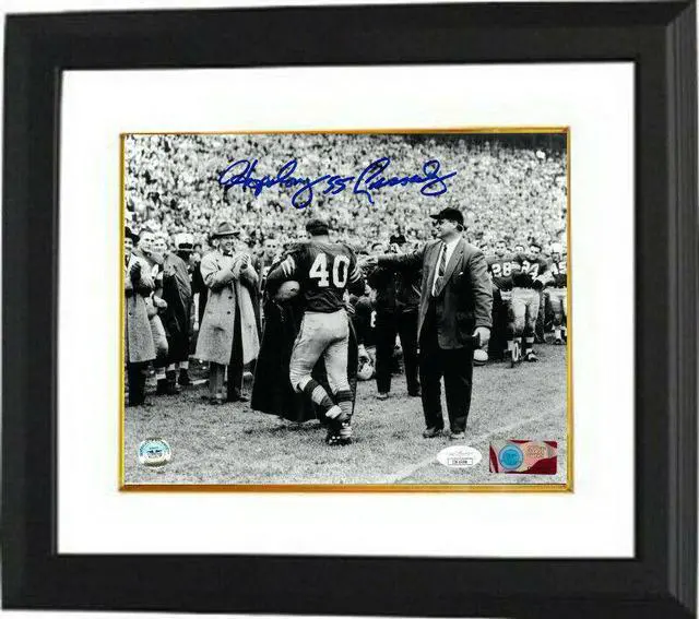 Hopalong Cassady played for the Ohio State Buckeyes from 1952-55. During his college career, he scored 37 touchdowns in 36 games. He also played defensive back; a pass was never completed on him in his four years at the university. In 1955, Cassady won the Heisman Trophy (by the largest margin at the time), the Maxwell Award, and was named the Associated Press Athlete of the Year. Hopalong Cassady has hand autographed this Ohio State Buckeyes B&W Last Game 8x10 Photo (with Coach Woody Hayes) with 55 inscription blue sig horizontal. JSA Authentication Sticker & JSA Certificate of Authenticity.