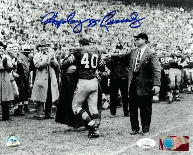 Hopalong Cassady played for the Ohio State Buckeyes from 1952-55. During his college career, he scored 37 touchdowns in 36 games. He also played defensive back; a pass was never completed on him in his four years at the university. In 1955, Cassady won the Heisman Trophy (by the largest margin at the time), the Maxwell Award, and was named the Associated Press Athlete of the Year. Hopalong Cassady has hand autographed this Ohio State Buckeyes B&W Last Game NCAA Licensed 8x10 Photo (with Coach Woody Hayes) with 55 inscription blue sig horizontal. JSA Authentication Sticker & JSA Certificate of Authenticity.