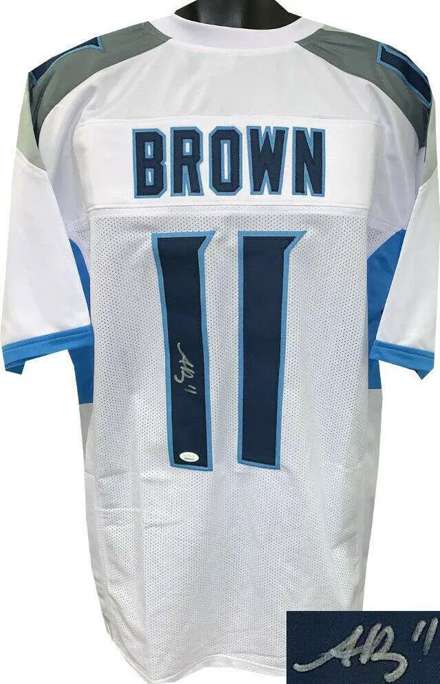 This is a new, in stock, AJ Brown signed White unlicensed Custom Stitched Pro Style Football Jersey #11 with fully stitched twill numbers on the front and back and players name plate, there are NO LOGOS, TAGS, BRAND NAMES or PATCHES ON THIS JERSEY & IS NOT AN OFFICIAL LICENSED JERSEY, 100% polyester, made in the Philippines. Size XL (48/50). Photo of the Signing, JSA Witnessed Authentication Sticker with JSA Certificate of Authenticity. Private signing Nashville, TN, 7/21/20.