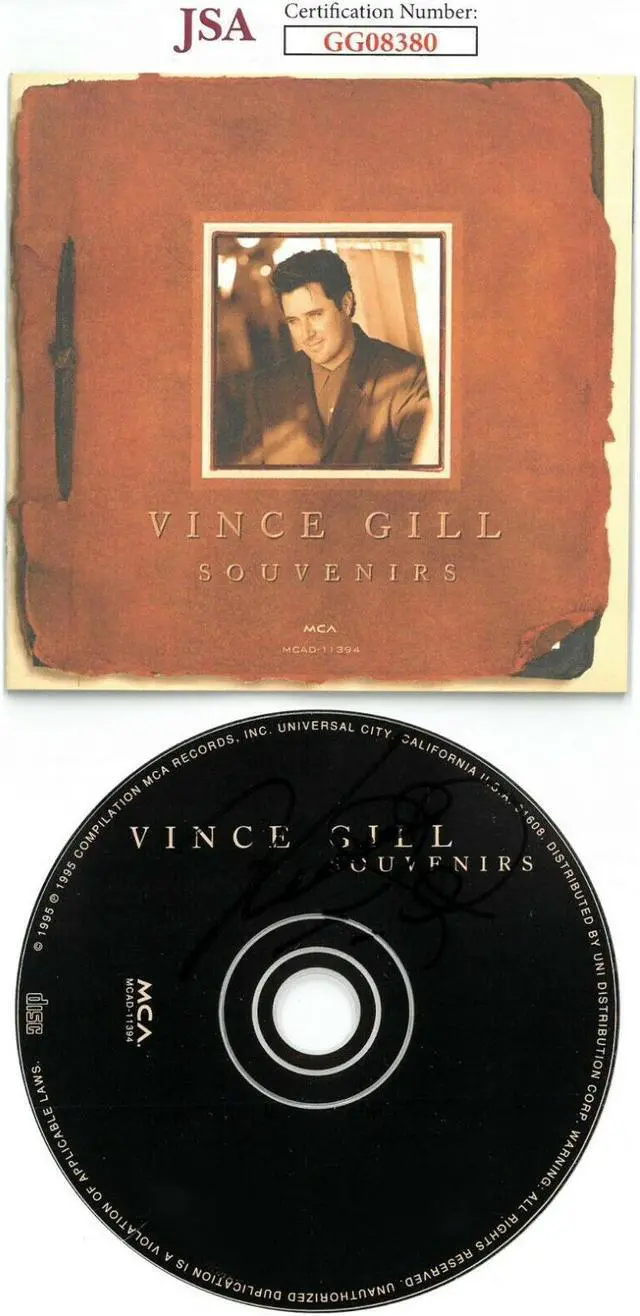 Gill has been married to singer Amy Grant since March 2000. Vince Gill has hand signed this Souvenirs Album CD with CD Cover. JSA Authentication Sticker #GG08380 & JSA Certificate of Authenticity. Handling/condition as shown.