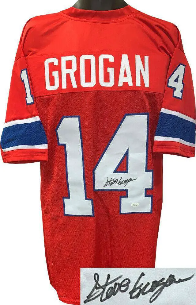 This is a new, in stock, Steve Grogan signed Red Throwback unlicensed Custom Stitched Pro Style Football Jersey with fully stitched twill numbers on the front and back and players name plate, there are NO LOGOS, TAGS, BRAND NAMES or PATCHES ON THIS JERSEY & IS NOT AN AUTHENTIC OFFICIALLY LICENSED JERSEY, 100% polyester, made in the Philippines. Size XL (48/50). JSA Witnessed Authentication Sticker with JSA Certificate of Authenticity
