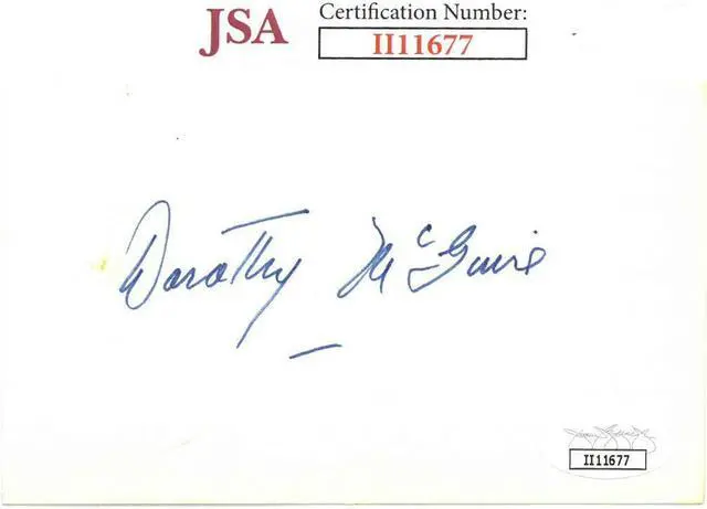 Dorothy McGuire was an American actress. She was nominated for the Academy Award for Best Actress for Gentleman's Agreement (1947) and won the National Board of Review Award for Best Actress for Friendly Persuasion. Dorothy McGuire has hand signed this 3x5 Index Card. JSA Authentication Sticker & Certificate of Authenticity #II11677